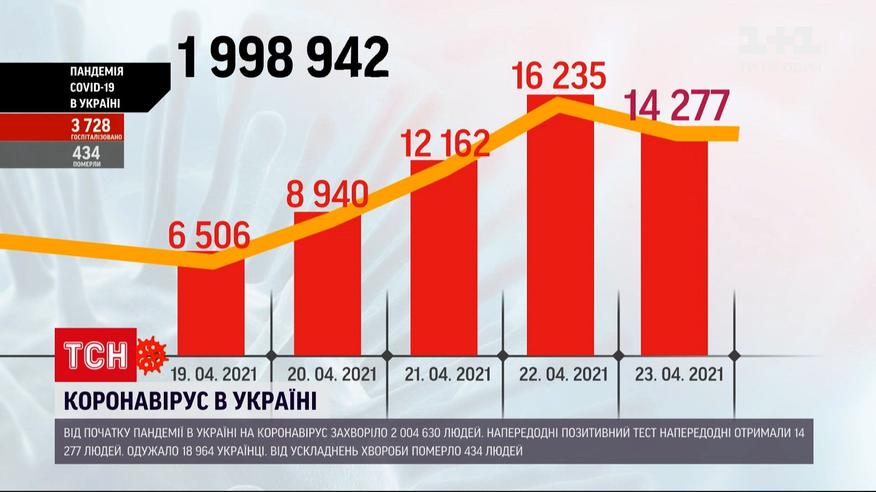 Двухмиллионную границу пересекли. С начала пандемии в Украине уже есть 2 миллиона 4 тысячи 630 случаев инфицирования коронавирусом. Накануне положительные тесты получили 14 277 человек. Выздоровели больше - почти 19 тысяч человек. Умерло от COVID-19 в четверг 434 человека. И по темпам заболеваемости Днепропетровская область обогнала столицу. В пятерке лидеров по инфицированию также Харьковская, Львовская и Киевская области. Пик заболеваемости, считает министр здравоохранения, Украина пересекла, однако очередная волна коронавируса может накрыть нас после Пасхи. Больше о коронавирусе в Украине