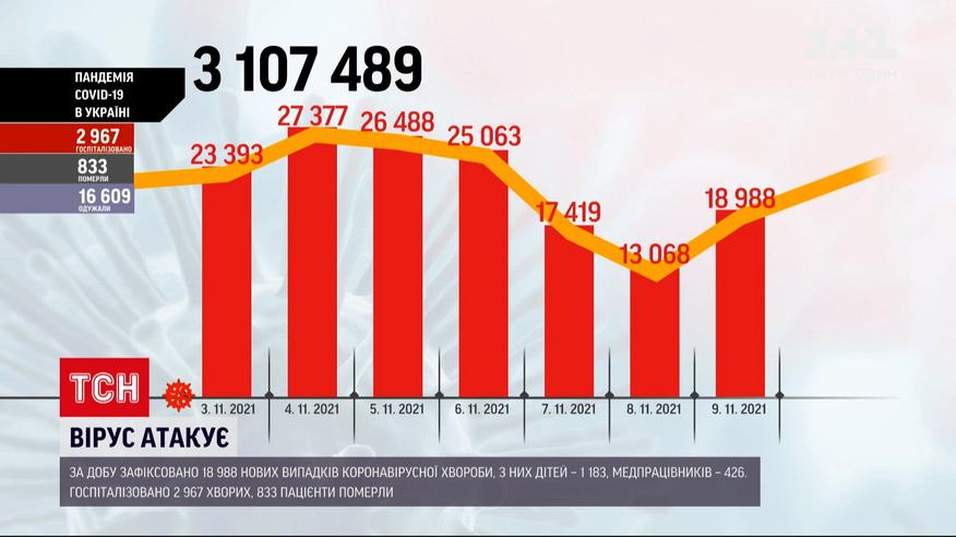 Новый рекорд смертности от COVID был зафиксирован в Украине. За сутки скончались 833 человека. С начала пандемии болезнь унесла более 73 тысяч жизней. Число новых нездоровых за прошедшие сутки пошло вверх - накануне диагноз подтвердили у почти 19 тысяч человек. Стремительнее всего инфекция распространяется в городах-миллионниках. Абсолютный лидер – Днепр. Там более 2 тысяч новых больных в сутки. Почти 3 тысячи больных попали в госпитали. Больше о коронавирусе в Украине
