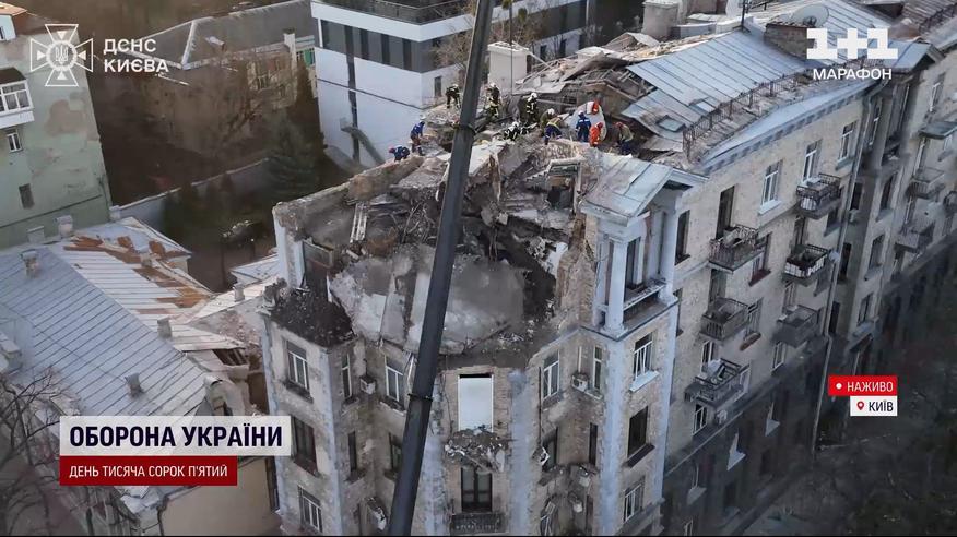 А в Правительственном квартале продолжается ликвидация последствий российской атаки на Киев 1-го января. Тогда было разрушено 17 зданий, больше всего - на углу Институтской и Банковой. Там взрывом снесло несколько этажей, заняло крыши соседних построек. Спасатели оперативно потушили пожар. Погибли два человека. Подробности расскажет корреспондент ТСН Сергей Моргун.