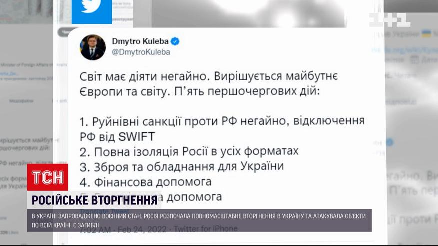 Мир должен действовать немедленно, потому что решается будущее его и Европы. Об этом написал министр иностранных дел Дмитрий Кулеба. Он призвал немедленно ввести разрушительные санкции против России - которые будут предусматривать, в частности, отключение государства-агрессоры от международной банковской системы СВИФТ. Украине же Дмитрий Кулеба призывает оказать оружие, оборудование, финансовую и гуманитарную помощь.