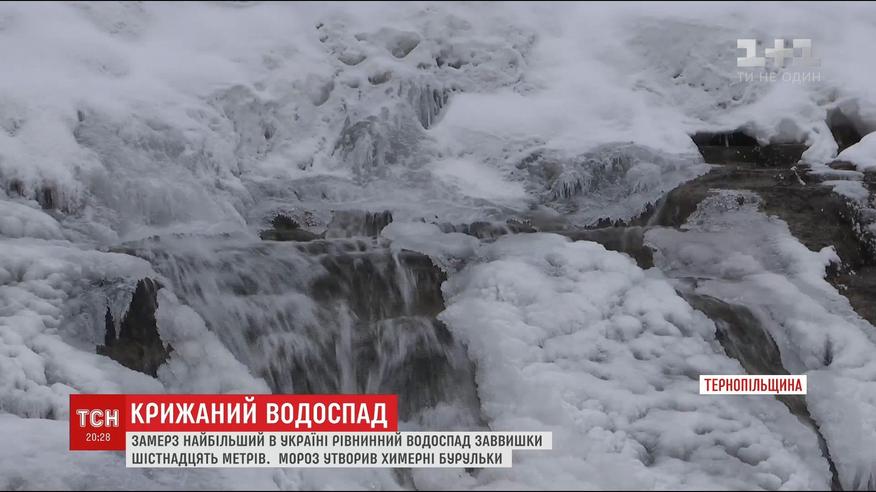 Ледяная корка покрыла крупнейший в Украине равнинный водопад