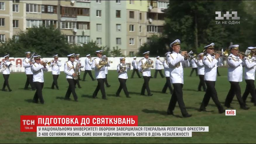 Сейчас в Национальном университете обороны завершилась генеральная репетиция оркестра. Участников собирали по всем областям Украины. Лучшие - а это четыре сотни музыкантов - уже в четверг начнут праздник на столичном Крещатике.