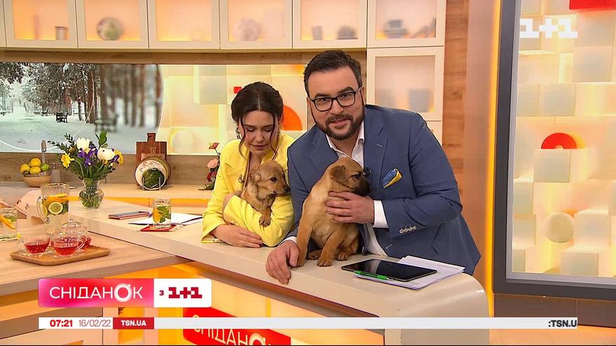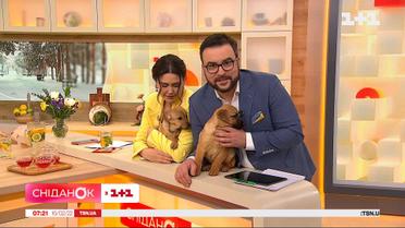 Сегодня у нас в гостях Ляля и Лелик. Маленьких щенков вместе с мамой спасли с улицы волонтеры и теперь они ищут дом. Щенкам 4 месяца. Очень игривые и любознательные. Если хотите забрать их домой – звоните. Номер волонтера на экранах.