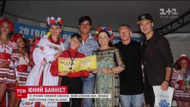 12-летний Тимофей Елисеев стал на творческий путь четыре года назад, и сегодня уже имеет 35 различных медалей и дипломов за игру на баяне. Это впечатляющий результат для его здоровья. Ребенок при жизни перенесла шесть операций, он без глаза. Ко всему, у мальчика погибла мама.