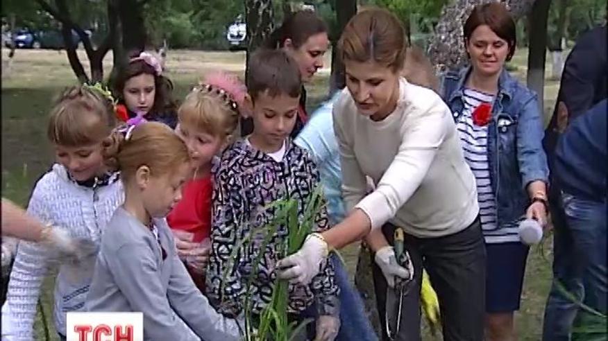 Марина Порошенко вместе с детьми помогала сажать цветы в одной из столичных школ