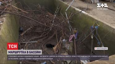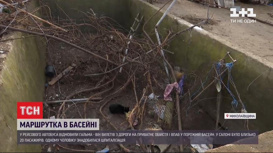 Маршрутка в бассейне. В Николаевской области рейсовый автобус слетел с дороги прямо на личное подворье. Снес забор, беседку и, наконец, упал в пустой бассейн 2 метра глубиной. В салоне было около 2 десятков пассажиров, среди них трое детей. Травмированных людей вытаскивали местные жители. Госпитализировали только одного человека - его выбросило из маршрутки на камни. У него черепно-мозговая травма. Но угрозы для жизни нет. Еще одна женщина на амбулаторном лечении. Остальные пассажиры отделались ушибами и ссадинами. Водитель уверяет - у автобуса отказали тормоза.