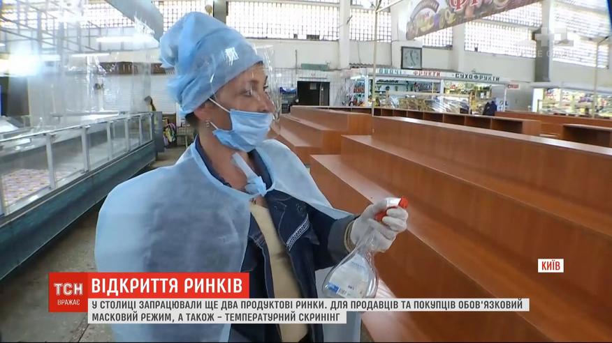 Сегодня в столице заработали два продуктовых рынка - Владимирский и Печерский. Накануне возобновили работу еще три. На входе покупателям меряют температуру, с высокой - не пускают. Среди обязательных условий - защитные маска и перчатки. Больше о коронавирусе
