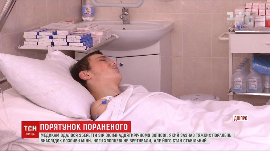 Мина взорвалась прямо под 18-летним бойцом. Одну ногу спасти не удалось. Изрешеченный осколками, с огромной кровопотерей, его едва смогли доставить к Днепру. Руслан выдержал уже шесть операций. Чтобы спасти глаза, медики под микроскопом 2,5 часа доставали сотни мелких осколков и сшивали разорванные ткани.