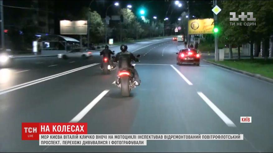 В необычный способ Виталий Кличко проверял качество дорог в Киеве. На втором мотоцикле рядом с мэром прокатился руководитель столичного автодора. Чиновники курсировали только что отремонтированным Воздухофлотским проспектом и наконец подтвердили - новая дорога им нравится.