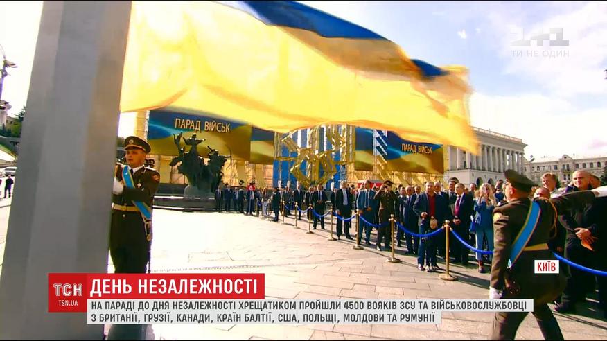 В столице состоялся военный парад, которого Украина еще не видела. Впервые вместе с нашими военными по Крещатике прошли военнослужащие Вооруженных сил Великобритании, Грузии, Эстонии, Канады, Латвии, Литвы, Молдовы, Польши, Румынии и США. Происходило все с усиленными мерами безопасности: рамки-металлоискатели, кинологи с собаками, снайперские пары на крышах.