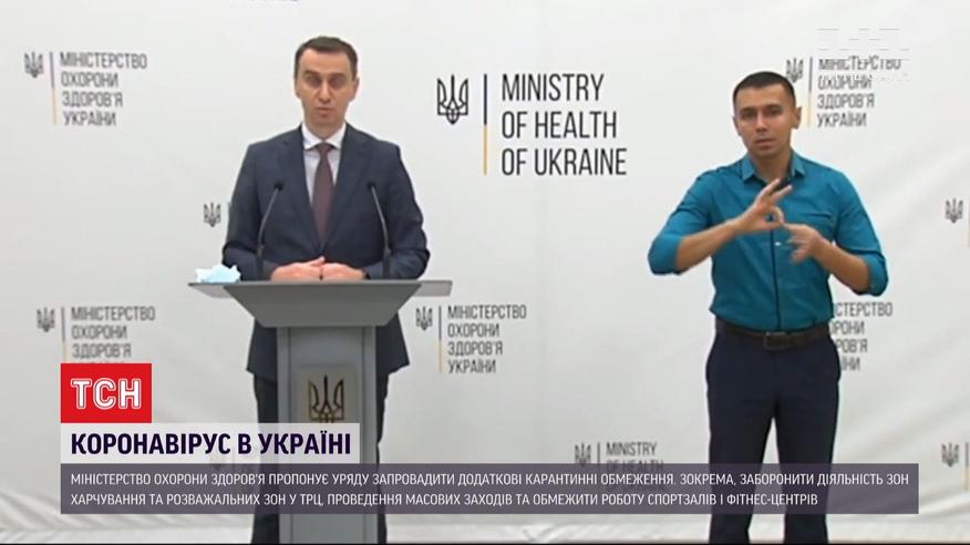 Дополнительные карантинные мероприятия ввести правительству предлагает Минздрав. Они будут касаться запрета деятельности зон питания и детских развлекательных зон в ТРЦ. Также министерство будет просить правительство запретить проведение всех массовых мероприятий, ограничить деятельность спортзалов, фитнес-центров и бассейнов и запретить деятельность всех заведений, которые не соблюдают санитарные нормы. Ранее премьер Денис Шмыгаль заявлял, что Украина не планирует вводить жесткий карантин, а министр Степанов анонсировал карантин выходного дня. Подробности - далее.