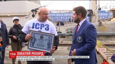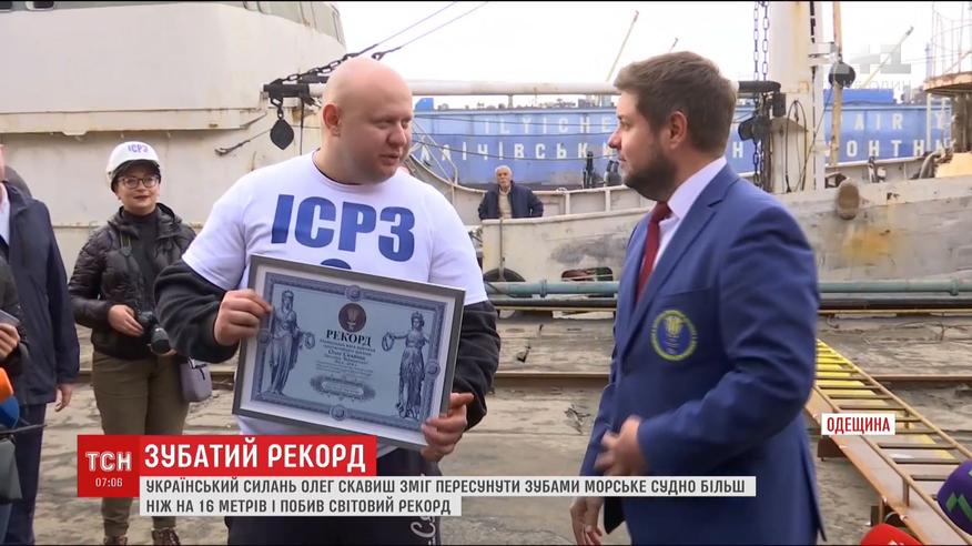 Олег Скавыш, по прозвищу "Тягнизуб", смог протащить судно более чем на 16 метров и таким образом, не только установил новый национальный, но и побил мировой рекорд. Рекорд Олег посвящает борьбе с жестоким обращением с животными.