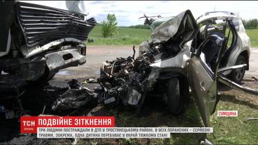 Авария произошла утром в Тростянецком районе. "Тойота" сначала столкнулась с легковушкой "Рено", после чего ее отбросило на грузовик на встречке. Во внедорожнике ехали 41-летний мужчина и двое его сыновей 7-ми и 9-ти лет. Отец вез детей на каникулы к бабушке. У всех - серьезные травмы, у одного мальчика политравма живота, открытая черепно-мозговая травма, он в коме.