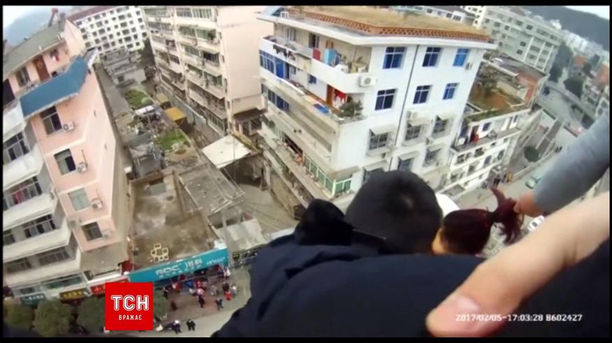 Инцидент произошел в китайской провинции Шэньси. Семья женщины сообщила, что та пытается совершить самоубийство. Полицейские прибыли сразу же, и спасли и самоубийцу, и мужчину, который успел схватить свою жена за волосы во время прыжка. Причина такого отчаянного поступка неизвестна.