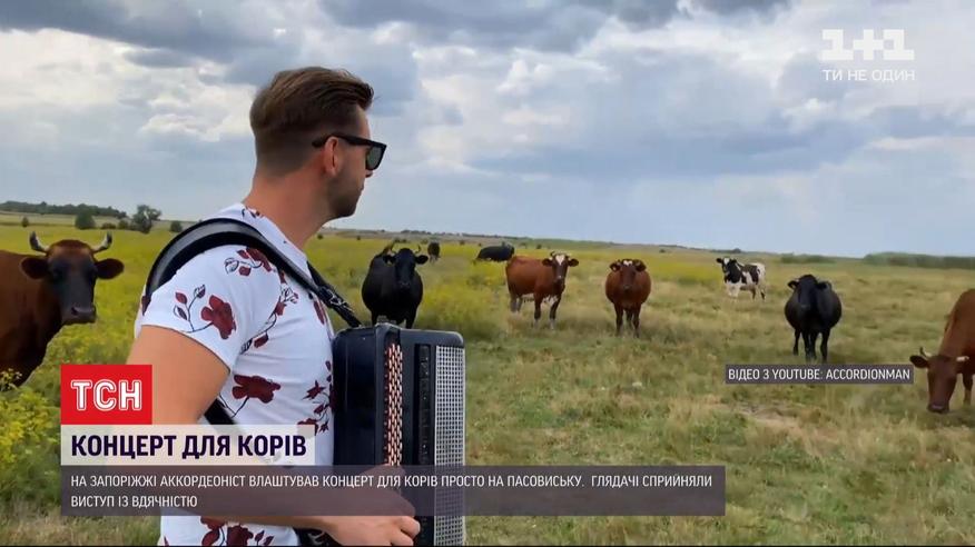 В Запорожской области аккордеонист решил сыграть для рогатого скота прямо на пастбище. Все Сергей Шамрай - так зовут исполнителя - снимал на видео и кадры распространил в Сети. Уже первые ноты на кнопочном аккордеоне привлекли внимание большинства животных. Они сошлись к музыке. Видео уже набрало тысячи просмотров, в комментариях пользователи сети пошутили: мол такая инструментальная музыка увеличит надои вдвое.