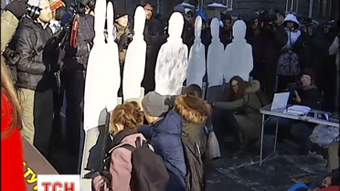Пострадавшие во время провокации 1 декабря 2013 на улице Банковой ровно через год на том же месте напомнили, как это было. Утверждают, что до сих пор ни один провокатор не задержан и не осужден.