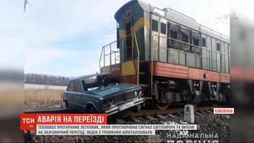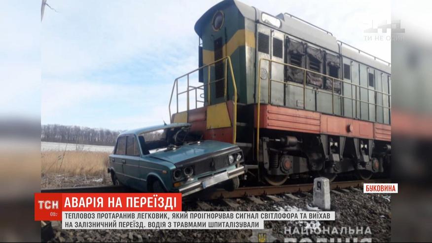 Авария произошла вблизи села Кливодин Кицманского района. Водитель "Жигулей" проигнорировал запрещающий сигнал светофора и выехал на железнодорожный переезд, где в него врезался тепловоз. Автомобиль сильно изуродовало, водителя - с травмами головы и руки - доставили в районную больницу.