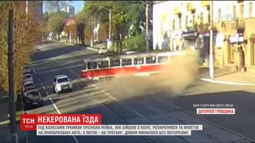 На Днепропетровщине трамвай сошел с рельсов, раскрутился и вылетел на тротуар