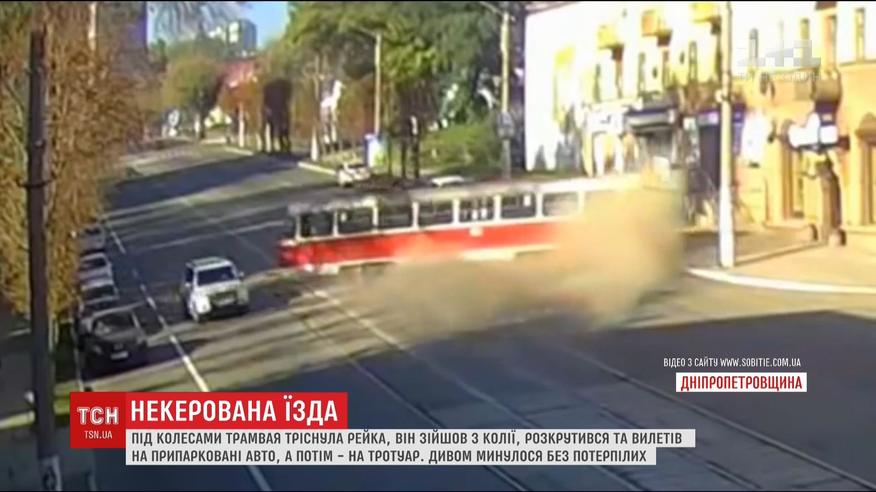 Взбешенный трамвай. В центре Каменского в Днепропетровской области вагон сошел с рельсов, раскрутился и пронесся асфальтом несколько метров. На своем пути разбил три припаркованные машины и вылетел на тротуар. Чудом обошлось без пострадавших: машины стояли пустые, а на тротуаре не было пешеходов.