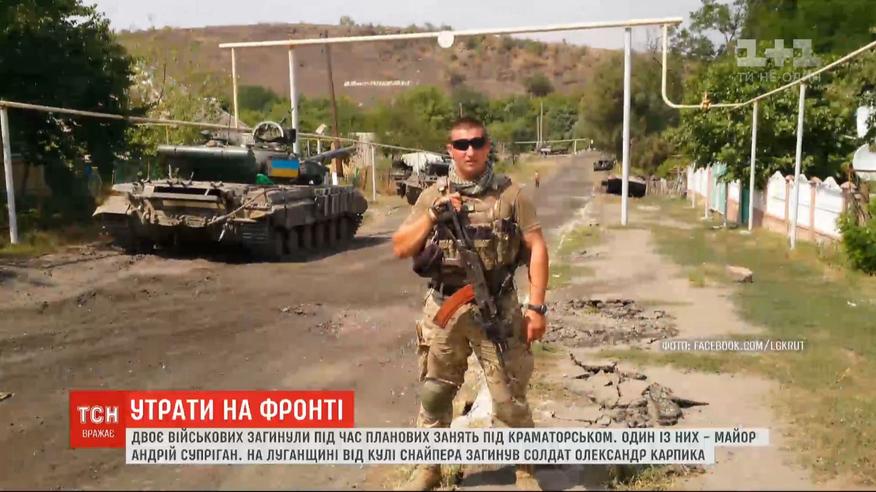 Двое десантников погибли около Краматорска во время плановых занятий. 30-летний майор Андрей Суприган был заместителем воинской части. Второй погибший - сержант Дмитрий Кузьменко. По данным ТСН, десантники утонули в результате неудачного приземления после прыжка с парашютом. А на передовой погиб 24-летний старший солдат Александр Карпика из Винницкой области. Больше о войне на Востоке Украины