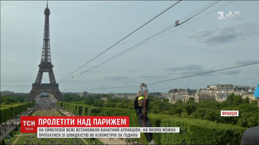 Гигантский канатный аттракцион, на котором можно разогнаться до скорости 90 километров в час, установили в центре Парижа. Всем желающим там предлагают спустились прочными металлическими тросами с верхушки Эйфелевой башни в начало Марсова поля.