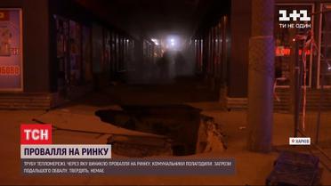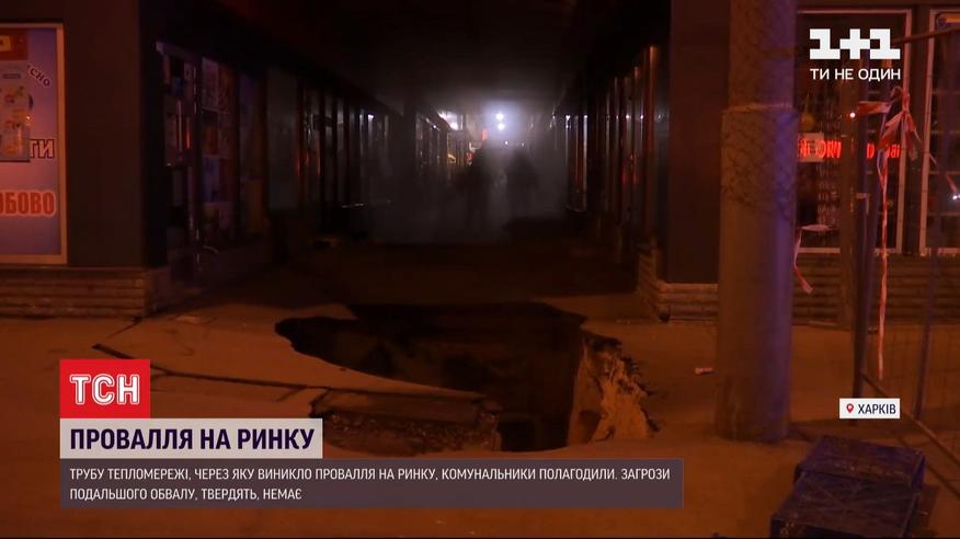 Пропасть на харьковском рынке - немалый кусок асфальта ушел под землю. Уже известно, что произошло это из-за аварии на теплосети. Без отопления остались близлежащие многоэтажки. Труба в спальном районе города разорвалась вечером: образовалась дыра диаметром несколько метров. Свидетели видели, как из пропасти повалил пар. Оказалось, вода подмыла грунт, и тот провалился.