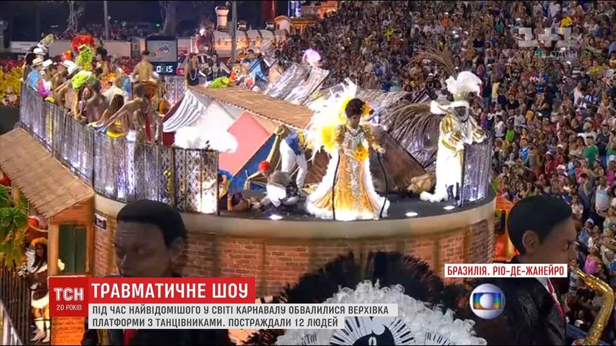 Во время выступления в Рио-де-Жанейро обрушилось верхняя часть платформы одной из школ самбы. По меньшей мере 12 человек получили травмы. Девять из них пришлось госпитализировали. Двое пострадавших в тяжелом состоянии. Из-за чрезвычайного происшествия парад приостановили на полчаса.