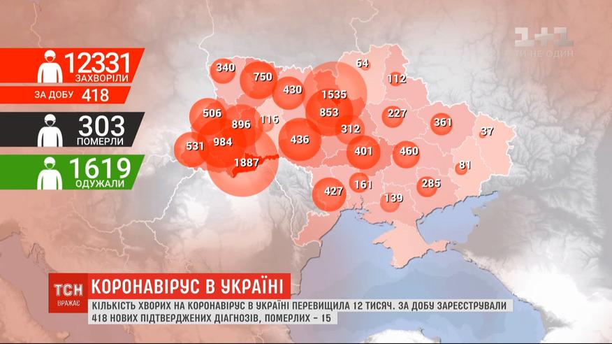 12 тысяч превысило количество подтвержденных диагнозов COVID-19 в Украине. Новые данные от Минздрава за минувшие сутки - 418 новых случаев заражения, 15 пациентов умерли. Всего в Украине 1619 больных на COVID-19 выздоровели, 303 человека от этой болезни умерли. Больше о коронавирусе