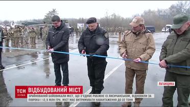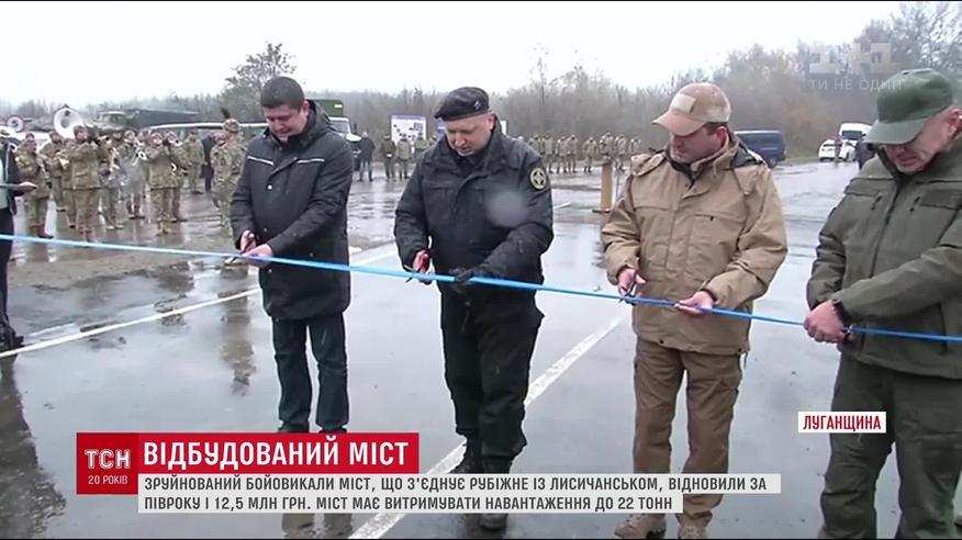 Его предшественника боевики разрушили в 2014 году. С тех пор грузовики должны были преодолевать несколько дополнительных десятков километров. Для машин, легких по 5 тонн, возвели временный мост. Стометровый мост обошелся в 12 с половиной миллионов гривен. На прочность конструкцию уже проверила военная техника.
