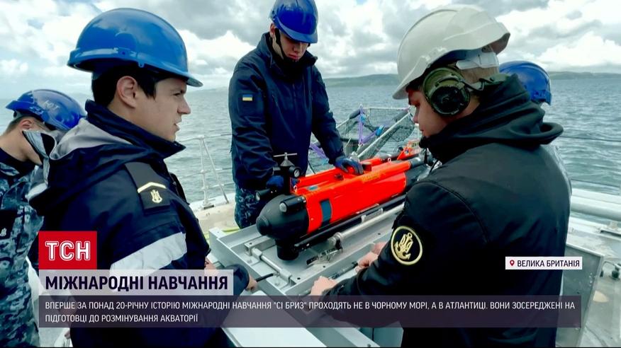 Уничтожение морских мин с помощью дронов. Впервые за более чем двадцатилетнюю историю международные учения "СИ-БРИЗ" проходят не в Черном море, а в Атлантике. В них участвуют восемнадцать стран. От Украины минные тральщики "Черкассы" и "Чернигов". Нынешний «Си Бриз» полностью сосредоточен на подготовке к разминированию Черного моря. Команда "Черниговая" тренировалась с помощью дистанционных подводных аппаратов "Sea fox". Управляя дроном из операционной комнаты члены экипажа обнаружили обучающую мину, которую должны уничтожить уже другим аппаратом типа Charly.