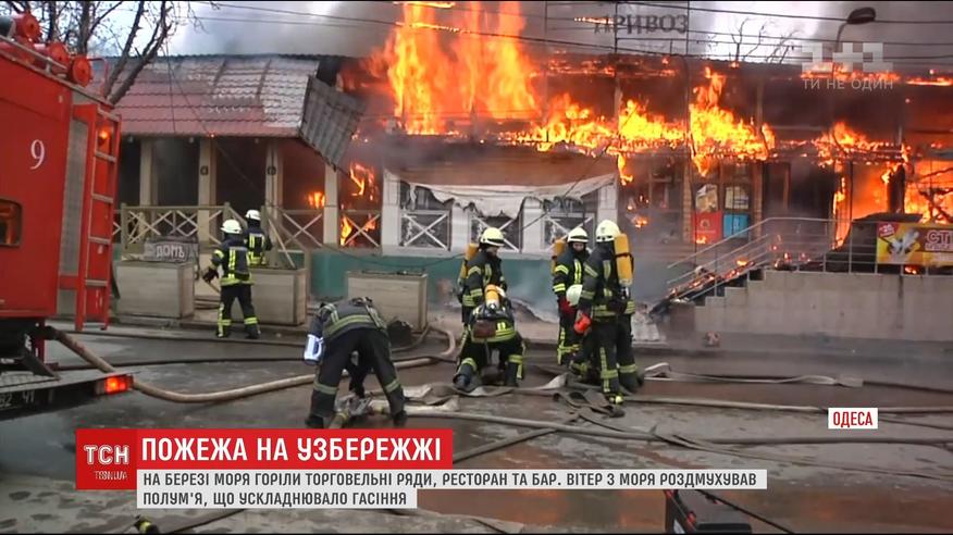 На Фонтане занялись торговые ряды и помещение бара и ресторана. Дымом затянуло всю улицу. На место прибыли с десяток пожарных машин и более полусотни спасателей. Прежде всего пытались сбить огонь с крыши - ветер с моря раздувал пламя. Через более получаса пожар удалось обуздать.