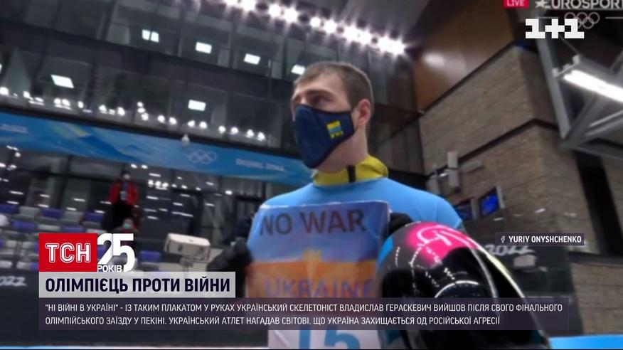 Нет войне в Украине"! С таким плакатом в руках украинский скелетонист Владислав Гераскевич вышел после финального олимпийского заезда в Пекине. Украинский атлет молча напомнил всему миру, что Украина защищается от российской агрессии.