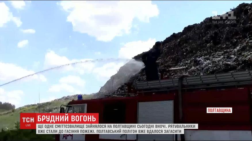 Под Лубнами горит почти 2 гектара полигона твердых бытовых отходов. Спасатели уже начали тушить свалку. А вот пожар на Полтавскую свалку, что горела два дня подряд, удалось обуздать. Накануне вечером спасатели еще раз тщательно проверили свалку и признаков горения и тления не обнаружили. Всего на ликвидацию возгорания, возникшего на площади 150 квадратных метров, были задействовано три десятка спасателей и 7 единиц техники.