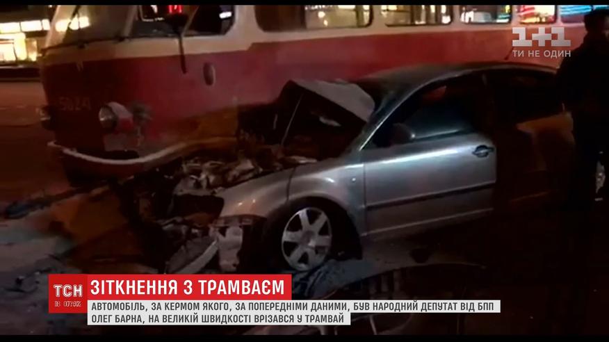 На большой скорости в трамвай врезался ночью автомобиль, за рулем которого якобы был народный депутат Олег Барна. Удар был такой силы, что 20-тонный вагон слетел с пути, а передняя часть машины превратилась в груду металлолома.
