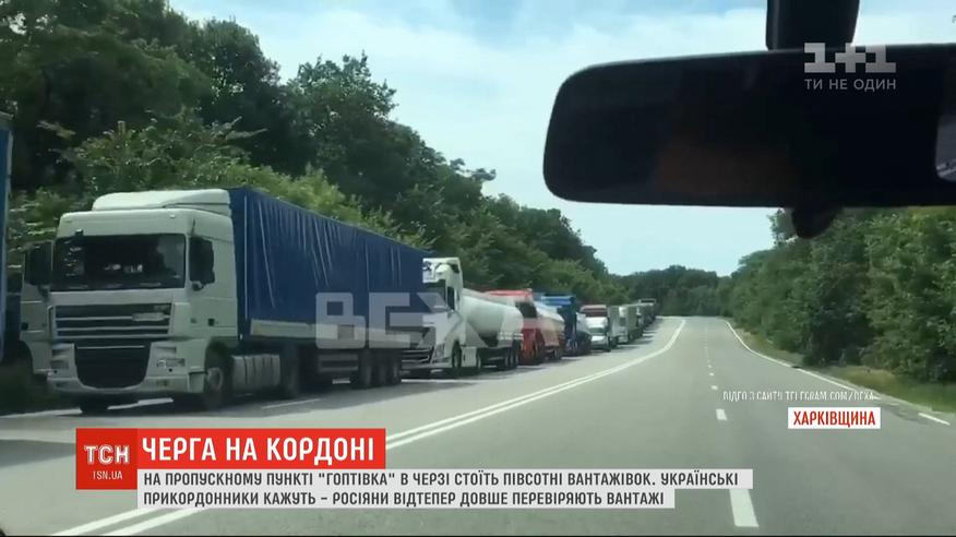 Очереди на российско-украинской границе. На пропускном пункте "Гоптовка" в Харьковской области застряло около полусотни машин на выезд. Тромб из грузовиков растянулся почти на километр. Водители стоят в очереди с самого утра. По 9 часов границу в направлении России пересекли лишь три десятка фур. Украинские пограничники задержку в перевозках объясняют тем, что россияне стали тратить больше времени на проверку и оформление грузов. Причину такой придирчивости не объясняют.