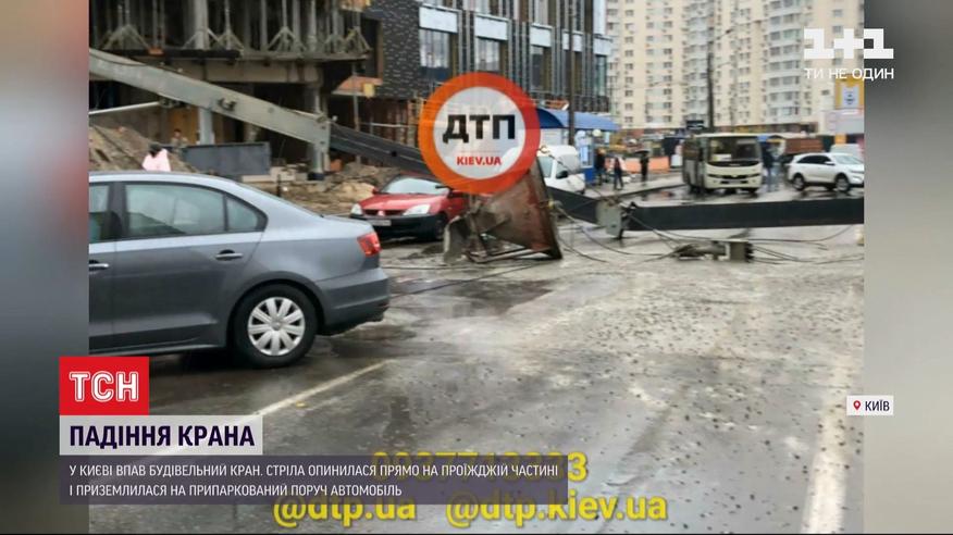 На столичных Позняках строительный кран упал на припаркованный рядом автомобиль