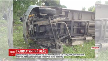 Микроавтобус внезапно выехал на встречную полосу движения, съехал в кювет и перевернулся. По словам водителя, в салоне находились десять пассажиров. Восемь из них были госпитализированы, двух тяжелых в тяжелом состоянии с травмами головы доставили в Сумскую областную больницу. Это пенсионерка и 10-летний мальчик, который ехал в маршрутке без сопровождения взрослых.