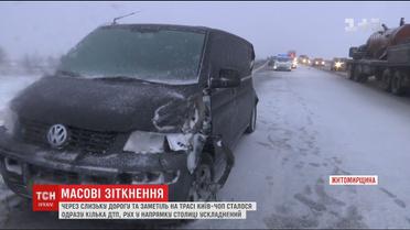 На объездной Коростышева столкнулось 6 машин, направлявшихся в сторону столицы. По словам водителей, в легковой автомобиль, который занесло на ледяной дороге, въехал грузовик, а потом началась цепная реакция, и в авто, что столкнулись, въехали еще одна фура, рейсовый автобус и две легковушки.