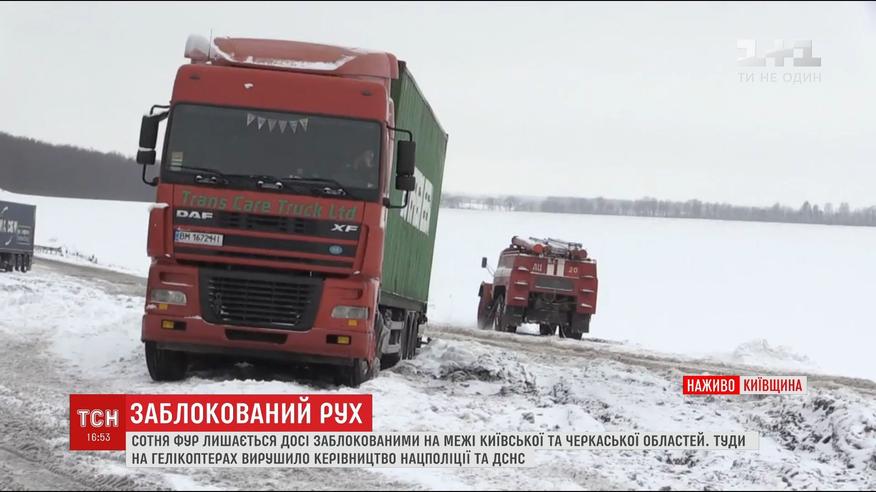 Около ста фур с начала непогоды заблокированы на трассе Киев-Одесса, на границе Киевской и Черкасской областей. Ситуация настолько сложная, что спасатели и Нацполиция доставались до места вертолетом, чтобы оценить реальный масштаб транспортного коллапса.