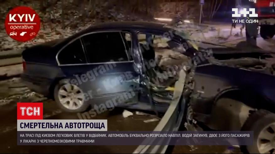 Водитель погиб на месте, двое пассажиров с черепно-мозговыми травмами в больнице. На трассе под Киевом легковушка влетела в отбойник. Автомобиль буквально разрубило пополам. Подробности в сюжете.