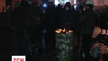 На Грушевского люди больше работают одни остаются охранять баррикадах это отряды самообороны, а другие помогают собирать мешки и сбивать их в баррикады.
