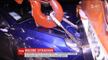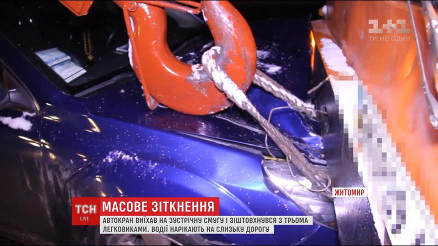 На выезде из Житомира произошло масштабное ДТП с участием трех легковых автомобилей и автокрана