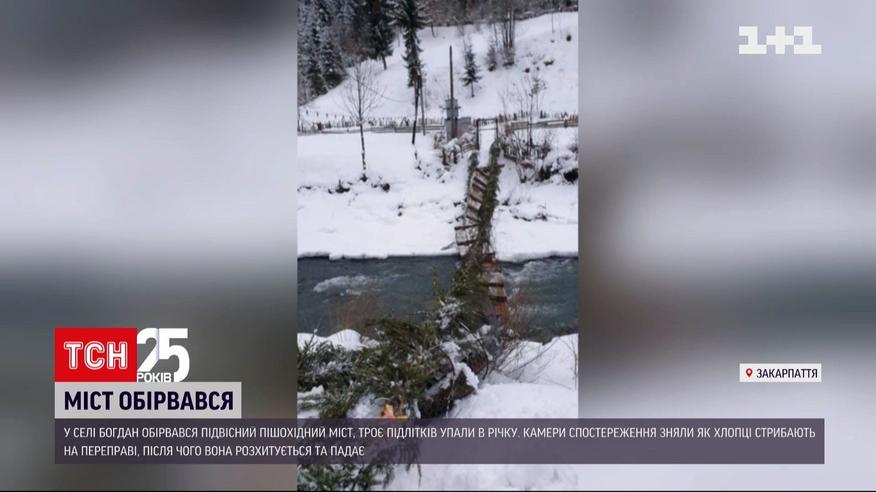 Подвесной пешеходный мост, на котором в этот момент находились дети, оборвался на Закарпатье. Трое подростков упали в реку. Произошло это в селе Богдан в Раховском районе. Как оборвалась переправа, сняли камеры слежения. На кадрах видно, как школьники заходят на мост и, придя к середине, начинают прыгать. Переправа начинает сильно расшатываться и ломается. Подростков получили, угрозы их жизни нет. По предварительной информации, только один из пострадавших травмировал ногу, остальные двое отделались испугом.