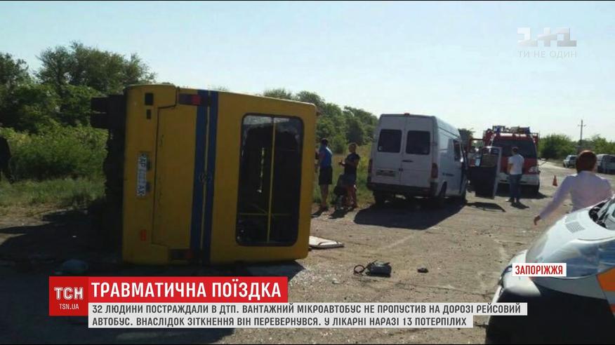 На дороге близ Мелитополя столкнулись пассажирский автобус и грузовой микробус. На данный момент 13 человек - в больнице, пятеро - в тяжелом состоянии. Авария произошла утром. Предварительно установлено, что грузовое авто выезжало со второстепенной дороги и несмотря на знаки и хорошую видимость не пропустило рейсовый автобус с пассажирами. От столкновения он перевернулся.