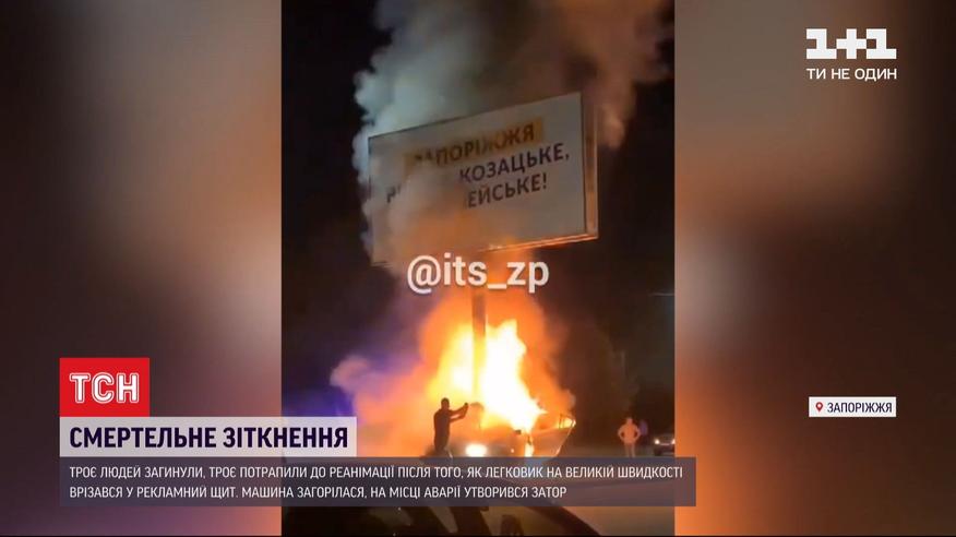 В Запорожье трое человек погибли, еще трое в реанимации - ужасная авария произошла на Набережной. В ночь "БМВ" на евро номерах на большой скорости вылетел на разделительную полосу и протаранил рекламный щит. Автомобиль вспыхнул. По предварительным данным, в салоне "БМВ" находились 6 человек. Потушить пламя до прибытия пожарных пытались другие автомобилисты. Но спасти всех им не удалось. Трое пассажиров погибли в огне. На месте аварии образовался огромный затор, на Набережной до утра работали спасатели и следователи. Трех пострадавших доставили в центр экстремальной медицины, все - в крайне тяжелом состоянии.