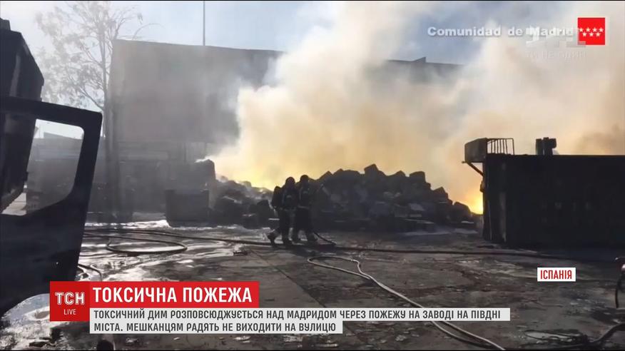 Спасательные службы объявили о высоком уровне опасности в испанской столице. Вредные вещества в воздухе зафиксировали из-за пожара на заводе на юге города, преодолеть который пытаются уже в течение пяти часов. Несколько сотен человек пришлось эвакуировать, один из спасателей получил тяжелые ожоги.