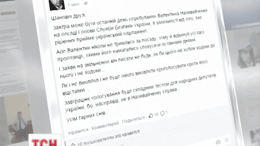 Правда, не лично, а через своего советника. Маркиян Лубкивский написал в Фейсбуке: "Завтра может быть последний день пребывания Валентина Наливайченко в должности. Валентин никогда не держался за должность, потому и отверг все лакомые предложения".