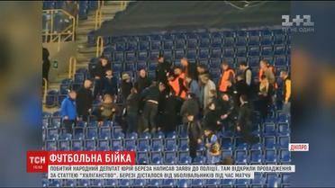 У него разбито лицо. По факту нанесения телесных повреждений открыли производство по статье хулиганство. Сам Береза сейчас снимает побои. Накануне он оказался в центре противостояния футбольных болельщиков ФК "Днепр" и СК "Днепр-1" на стадионе Днепр-Арена. После матча в фан-секторе произошло столкновение. Береза является почетным президентом клуба СК "Днепр-1".