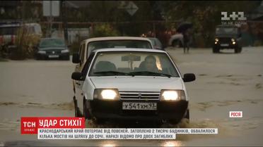 Стихийное бедствие в России. В Краснодарском крае в результате потопа двое погибших людей и две тысячи затопленных домов. На пути к известному курорту Сочи селевые потоки оборвали несколько мостов. На других автострадах - пробки. Люди массово скупают продукты, питьевую воду и бензин.