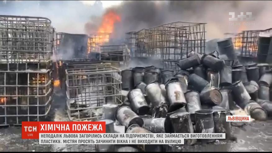 Горели склады на открытой территории. Сейчас известно об одном пострадавшем - работнике предприятия. У него ожоги тела и дыхательных путей. Огонь уже уничтожил четыре автомобиля и перекинулся на здание рядом. Пожар всего лишь в 10 километрах от Львова, дым несет на город.